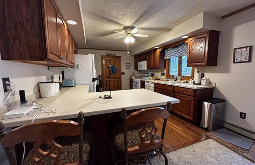 The features of this home are a plenty! Walking in the main living room you will find plenty of seating for your entire group and a wood burning stove, plenty of wood will be supplied to build you a cozy fire in the winter months. From the main living area you can walk into the dining area and the fully stocked kitchen ready for you to get your inner chef on for your group!