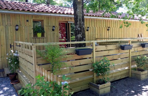 New wooden chalet, 2 bedrooms, separate WC bathroom on 35 m2, shaded wooden terrace of 22 m2. Fitted kitchen with induction hob, extractor hood, dishwasher, top fridge, washing machine ... Towels and sheets provided.