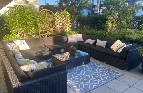 This 755 sq. ft 1 bedroom and Den fully furnished condo has a beautiful 500 sqft private patio, is an ideal location for your vacation or a longer stay while working in Vancouver, or transitioning to a new home.