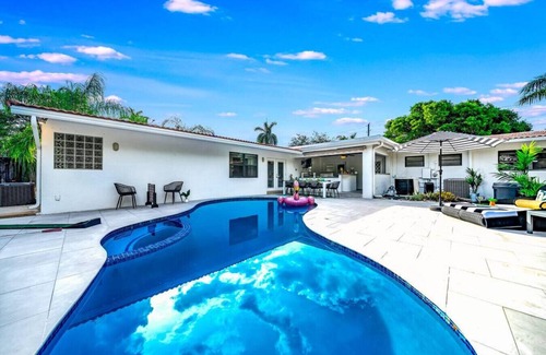 Welcome to your private getaway oasis! This 4 bed + 3 bath + large heated pool + hot tub / jacuzzi + 5 min to beach + outdoor bar space + fire pit + free coffee bar + 10 min to airport + billiards + foosball + ping pong + smart TVs in every room + comfy beds + lots of parking + pack n play + stylish decoration and design. The property is near to coolest neighborhoods in South Florida!This special place is close to everything, making it easy to plan your visit.