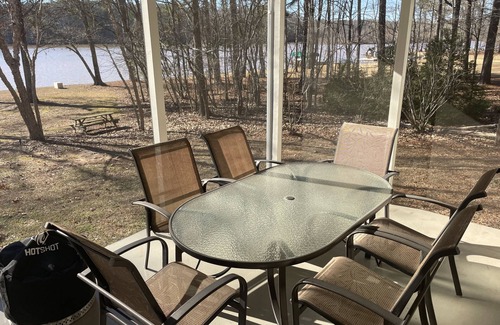 LAKEFRONT HOME IN BEST LAKE OCONEE LOCATION! This 4 bedroom, 3.5 bath home is located in the lake's most convenient location with a new composite max dock and amazing sunset lake views. The cute and well maintained home has been upgraded with hardwood flooring, updated kitchen with granite counter tops and stainless steel appliances, and an open floor plan. Outside is a large level lot with winding driveway, covered 2 car carport, and a wonderful lakeside screened deck to watch those sunsets. This retreat has two bedrooms on the main level each with their own full bathrooms, also one half bath on the main. There are two bedrooms upstairs, one with a full size bed and one is a bunk room with two sets of bunk beds and a twin bed with a trundle bed. Back porch is screened-in with a dining table and loungers. Enjoy the propane grill, firepit, and lake toys.