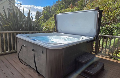 Just outside the dining area is a luxurious hot tub and propane BBQ that will be welcome after a day of enjoying the beautiful coast. In the front of the house, there is a dining table so you can enjoy a peaceful setting with the breeze from the Bay and the lovely landscaped yard.