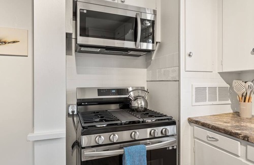 As soon as you walk in the front door, you’ll feel right at home. Filled with tons of natural light, the inviting living space features a plush sofa, leather armchair, modern art, a TV with Hulu Live, and elegantly artisanal furnishings and decor. The full kitchen is tucked away just off the living space, and is stocked with everything you need to prepare meals or snacks, including a drip coffee maker, toaster, microwave, gas stove, and refrigerator with freezer. Adjacent to the kitchen is the cozy dining room, perfect for intimate candlelight dinners or pancake breakfasts with friends before a full day of shopping and sightseeing. The two cozy bedrooms welcome you home each night, featuring queen beds with luxurious bedding, privacy shades, and cool, relaxing color schemes.