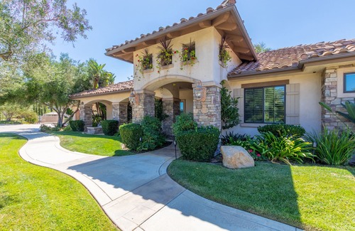 La Bella Vista Estate is one of Fallbrook’s premier custom homes, perfectly situated within walking distance of both Monserate Winery and Fallbrook Winery. Perched high on a ridge, this Tuscan-style estate offers breathtaking 360-degree views of the surrounding countryside, reminiscent of the rolling hills of Tuscany. From the backyard, the sweeping valley vistas showcase neighboring multi-million-dollar estates, creating an unmatched setting of beauty and serenity. Directly across the street lies the 47-acre Gird Valley Preserve, where miles of pristine hiking trails meander through nature and lead down to Monserate Winery. Nestled on a quiet and private two-acre lot, the estate features over 80 producing fruit trees, scenic walking paths, and even a flock of chickens that provide fresh, colorful eggs for the guests each morning. Despite its tranquil seclusion, the property is just 18 miles from the beaches of Oceanside and less than an hour from San Diego International Airport. Inside, the home comfortably accommodates groups with 3 king beds, 2 queen beds, and a twin bunk bed. Guests will enjoy an impressive array of amenities, including a solar-heated saltwater pool, hot tub, bocce court, and a lighted outdoor pavilion with a ping-pong table and many other games. Golf enthusiasts can take advantage of men’s and women’s clubs provided for use at the many championship courses in Fallbrook and Temecula. To fine tune your game this estate offers 5 different elevated pitching greens with flags across the picturesque valley with distances ranging from 55 yards to 85 yards. From an elevated tee area complete with clubs and baskets of balls guests can compete for the perfect shot. Full-size RV parking (up to 42 ft) with optional hookups is also available upon request. The main residence is designed for comfort and entertainment, offering a pool table, steam room, jetted soaking tub, two fireplaces, and formal dining for up to 16 guests. The chef’s kitchen boasts a Viking gas range with six burners, double ovens, warming drawer, wine cooler, and a fully stocked pantry for the guest’s use. For added convenience, the home features seven televisions, three separate refrigerator/freezers, an indoor/outdoor Sonos sound system, and a ChargePoint electric vehicle charger in the three-car garage. Connected by a breezeway, the private Casita adds even more flexibility with accommodations for five, a fully equipped fitness room with Hydrow Rowing Machine, and a brand-new Kyota Zero Gravity 4D Massage Chair. With its one-of-a-kind location, quality construction, unmatched views, and endless amenities, La Bella Vista Estate offers a luxury vacation experience like no other in the Fallbrook/Temecula area.