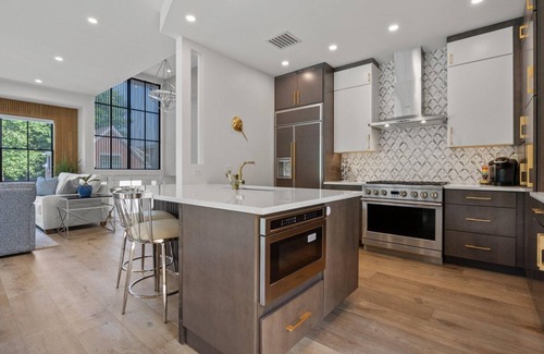 The kitchen will delight foodies! Nicely equipped with high-end stainless appliances and quartz countertops, the kitchen has counter seating and plenty of space to create a fantastic meal.