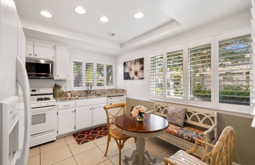 The bright condo boasts new furnishings designed for comfort, entertainment, and relaxation. In the living room, you'll find a large sofa, an electronic fireplace and a large TV. The dining area is connected to the living room, making it ideal for gatherings with family or friends. The dining table comfortably seats four people. The kitchen is well-stocked for all your meal preparation needs and features new countertops, a breakfast table, and plenty of natural light.