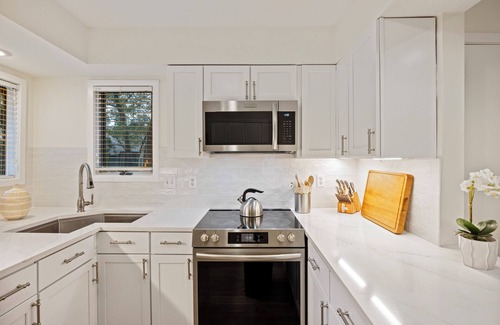 This lovely property has been updated with smart TVs, new flooring, paint, furniture and lighting. The fully-equipped kitchen boasts granite countertops and stainless steel appliances. For those who might need to work remote, there is a desk with a monitor and the property has complimentary WiFi. The open floor-plan and sectional sofa are ideal for relaxing and spending time with others. And when your ready to retire for the evening, each bedroom features a king-sized bed and a private bathroom.