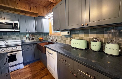 In the kitchen, you'll love the retro Big Chill appliances and amazing cookware making every meal prep a pleasure. Grab your morning latte from the unmatched coffee bar with a SMEG espresso machine and bean grinder, SMEG drip coffee maker, SMEG kettle, French press, and Keurig - you will enjoy being the Barista throughout your stay with coffee beans, sugar, and flavored syrups provided! Not an item was missed when appointing the kitchen making meal prep enjoyable and fun.