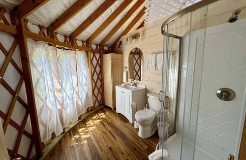 This is a new luxurious 24' yurt that is fully equipped with a small bathroom, kitchen, and a heat pump for climate control and comfort throughout the season.