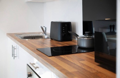 The kitchen is equipped with all the essentials needed to cook an array of meals whilst away in Manchester. There is an electric hob, oven, fridge/freezer, microwave, & washer.