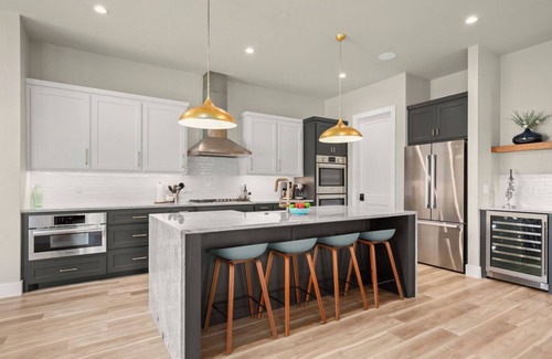 Our main living spaces include a gorgeous open floorplan living room / kitchen / dining on the second floor. This space has floor to ceiling windows in the dining space, and a room-wide sliding glass door out to a wrap around balcony to nearly double the living space and bring the outside in. This space is equipped with high-def entertainment system with surround sound which you'll enjoy from the comfortable sectional or club chairs. Adjacent to the living room there is also a built in office nook, so, if you must, bring the laptop and enjoy ultra-high speed wifi, not only there, but throughout the home. The chef's kitchen is modern, with a gas range and double ovens. Dishware for at least 15, and chef-inspired cookware, and small electrics. Full wet bar with wine fridge and icemaker. The dining room feels like you're suspended over the lake, with gorgeous views outside. Incredible place for a family meal. On the third floor is another entertainment space, the media loft. High def entertainment again with surround sound, comfortable seating, mini-fridge and coffee station as well as a private balcony. Send the kids upstairs to watch a movie or play a game while you entertain friends in the living room.