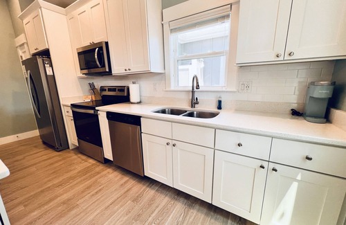 The fully equipped kitchen boasts stainless steel appliances, sparkling quartz countertops, and a grand island to seat 6. Grab your morning cup of joe with an easy to use Keurig, relax on the front patio and enjoy the fresh air, cook on your private gas grill, while the family relaxes in the shade of your quiet outdoor terrace, and rinse off after a day at the beach with your private outdoor shower.
