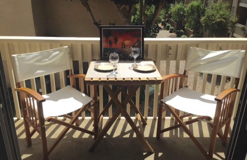 Patio/Deck has 4 Director's Chairs and Table overlooking a peaceful Courtyard. Perfect spot for your morning coffee. Peek a boo view of Sea World Tower from deck.