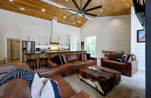 Step into the Midnight Cowboy Cabin, where luxury meets nature. Enjoy your own private swimming pool, relax in a hot tub with stunning views, and gather around a warm, crackling fire pit. Roast some smores, challenge someone to a game of ping pong or cozy up by the fireplace with your favorite book. This modern cabin in Broken Bow offers the perfect balance of natural beauty and luxury for an unforgettable vacation.