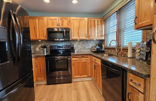 The kitchen has a table with six chairs; new appliances; a Keurig Duo coffee maker; K-cups; sugar; creamer; blender; coffee grinder; toaster; electric kettle; ample cabinets; granite countertops; and stone backsplash.