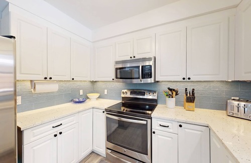 The KITCHEN is newly renovated with white cabinets, granite countertops and stainless steel appliances (refrigerator, stove/oven, microwave and dishwasher). It is fully equipped with pots/pans, knives, cutting boards, cups, plates, silverware and drip coffee maker and stocked with cooking staples such as spices, olive oil and coffee. Plastic plates and cups are provided for use outdoors and around the pool. The kitchen island faces the living space, and it has a breakfast bar with bar stools.