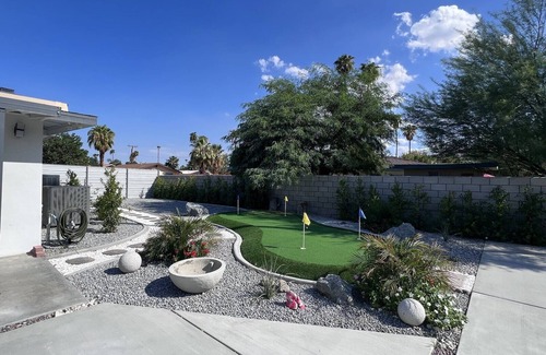 Welcome to The Pink Stone, a newly renovated home at Palm Springs! This estate features a colorful backyard with a 30ft pool & spa, panoramic mountain views of Mt. San Jacinto, and a mini golf course. Come and indulge the gas BBQ, pergola seating, and more!