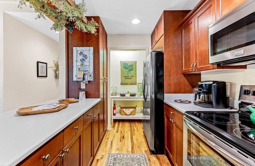 The interior of the home is filled with wood, giving the space rustic charm. If the nights get chilly, cozy up by the stone fireplace in the main living space. The kitchen, dining area, and a half bath are also on the main level, as well as one of the king bedrooms with an ensuite bathroom. Upstairs, find an open loft with games, a sitting area, and a bonus twin bed. The queen bedroom and a full bathroom are also upstairs. Downstairs, find another king bedroom, and washer/dryer.