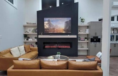 Step outside to the backyard patio, where you'll find a pizza oven, BBQ, and outdoor seating under a 40 x 10 foot pergola adorned with string lights. The washer and dryer on site, along with a wash basin and ironing board, ensure convenience for extended stays. For eco-conscious travelers, the Tesla EV charger with an extra-long cable is a welcome addition.