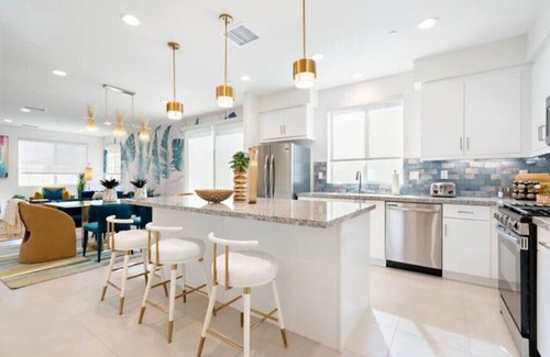 Experience the open-space concept that connects the kitchen with the living area while sliding doors allow for seamless indoor/outdoor living. Enjoy the latest entertainment on the 65" Samsung 4k Smart TV with high-speed internet. Relax on the large sectional sofa, perfect for game day or family movie night. The cabinets are stocked with board games and puzzles for added fun. Customize the mood with dimmable recessed lighting. Gather around the modern dining table that comfortably seats up to 8.