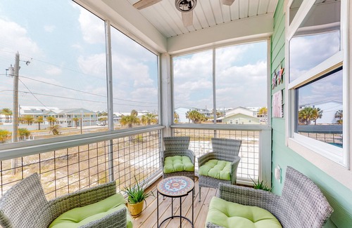 Newly built in 2021 in the aftermath of Hurricane Michael, the Cornerstone Beachside Cottage is bursting with character. Located Gulf-side of Hwy. 98, this charmer boasts gorgeous ocean views on three sides and an unbeatable location just a few steps from the beach. Pictures and mementos of the original 1950s cottage that once stood on this spot and other Mexico Beach landmarks are displayed around the home, including the downstairs 1/2-bath vanity, made from a recovered piece of the pier. The blanket bench at the foot of the main suite’s bed was custom-made from a diving platform, pulled from the woods after the hurricane, and the donated headboard is from the original El Governor Motel. Finally, the half-wall at the top of the stairs was custom-made from a WWII Liberty Ship hatch cover, and the three stained-glass windows, imported from England, found new life at Cornerstone via Savannah, GA.