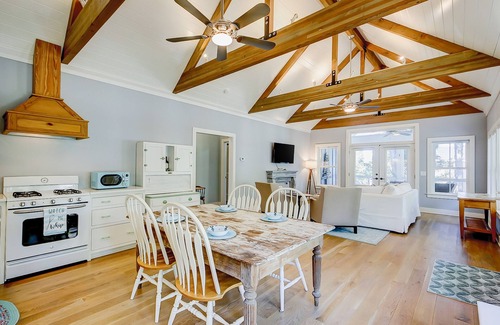 Inside, you'll be greeted by all sorts of thoughtful touches - vaulted ceilings with exposed cathedral beams, wide-plank hardwood floors, French doors with transoms, and central AC with ceiling fans throughout. There's an open-air kitchen with handmade cabinetry, Cambria quartz countertops, a vintage cast iron sink, and an adjoining pantry/laundry room. The outdoor spaces are every bit as special, including an expansive screened porch, a large deck for sunbathing, and a patio underneath the house with an enclosed outdoor shower (with hot water) and patio seating.