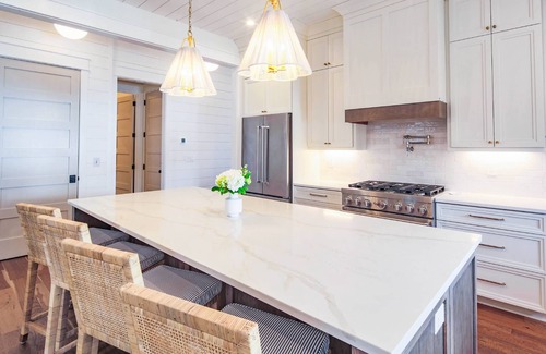 Come relax, recharge and bask in the glorious Isle of Palms sunshine at Sparkling Sea! This is the exceptional, custom built Isle of Palms vacation home that you've been looking for. This beautiful, newly built home features incredible outdoor spaces with a private pool, travertine-paved sundeck, putting green and large screened porch. The gorgeous interior of the home features shiplap walls, gorgeous tile work, beautiful furnishings & light fixtures and top of the line appliances. The open floor plan layout between the kitchen, living room and dining area make it very easy to interact with your guests. The primary suite (with its private outdoor deck with swing overlooking the backyard) and one guest bedroom are located on the lower level and the second primary suite, bunk bedroom and guest bedroom are located on the upper level near the family room.