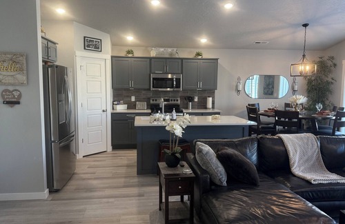 Experience the "BEST" of Meridian, Idaho from this beautiful 4 bedroom, 2 bath home; perfect for families, couples and business travelers. Unwind and relax in Meridian in this lovely NEW construction home, boasting approximately 1700 sq. ft. in a very nice and new neighborhood, located just off of 10 Mile Road and the freeway in Meridian. This area is referred to as "The New Center of the Treasure Valley". You will find easy access to shopping, dining and entertainment with parks scattered throughout the subdivision and in Meridian itself. It is located within walking distance to many new business, i.e Scheels Sporting Goods, and a wide array of Restaurants, and Shopping Venues. Nearby you will find Costco Wholesale, Roaring Springs Water Park, Wahootz Fun Center, Meridian Village Shopping Center, fine and casual dining and many nearby golf courses. Not only is it the center of the Treasure Valley in Meridian, it is so close to Boise, Eagle or Nampa/Caldwell. You will be able to walk to shopping or easily access the freeway to get anywhere quickly. Explore the Valley from this ideally located home and enjoy 4 spacious bedrooms. Sleeping options include new mattresses 1 king bed, 3 queen beds, and 1 double futon for 5 beds total with bonus single chase lounger in the living area. It will comfortably sleep anywhere from 1 to 11 guests. The home includes 2 bathrooms equipped with hair blowers, towels, shampoos and all the necessities. The ensuite Master Bedroom offers it's own personal bath with a large, oversized walk-in shower with a handheld shower massage, double sinks, and a huge-in closet. Bath two includes a bath/shower combo with a removeable handheld shower wand and bath one offers a large, oversized walk-in shower with another handheld wand, This home is NEW, SO CLEAN, in a SAFE neighborhood and is extremely comfortable and spacious. Guests will enjoy this homes' soothing atmosphere with amenities like a cozy, living room fireplace, 3 smart televisions with streaming channels, high speed internet, a beautiful glass filled firepit on the back patio and a gas BBQ grill for your outside grilling pleasure You will enjoy all new kitchen appliances, (cooking necessities provided), quartz countertops, newer furnishings and a new washer/dryer for your use. This home away from home has a double car garage with automatic door opener, and a water softener. Check in is easy and convenient with coded door locks. Fall in love with Meridian, Idaho and enjoy the magic this home has to offer. Weather you are visiting for business or pleasure, this home offers a comfortably relaxing, refreshing and convenient stay. Book your home away from home today and let us provide all the best for you! Your Hosts, Tami and Wes