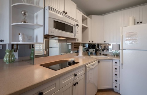 Adjacent to the living room is a fully equipped kitchenette, complete with modern appliances and all the essentials you’ll need to prepare delicious meals during your stay. Whether you’re whipping up a quick breakfast before heading out for the day or enjoying a leisurely dinner at home, the kitchen provides everything from a refrigerator, stove, microwave, dishwasher, and Kuerig coffee maker. The open layout allows you to stay connected with family or friends in the living area, making mealtime a shared experience.