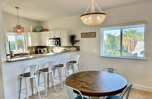 The fully equipped kitchen includes modern appliances, cookware, and dishes to make your meals at home a breeze. The table seats four guests and there are three additional seats at the kitchen island.