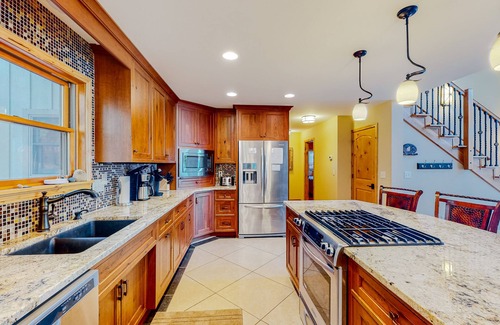 The main living space is located on the first floor of the home, where the living room, dining area, and kitchen can be found. Floor-to-ceiling windows allow you to admire breathtaking lake views from the comfort of the living room. This area has been furnished with guests' comfort in mind - find several inviting sofas, a large flatscreen TV, and a floor-to-ceiling fireplace. Appointed with modern stainless steel appliances, the full kitchen will have your back when mealtime comes around. Find everything you need to prepare top-quality meals and snacks for the group. The adjoining dining table seats up to six people and you can find two additional chairs at the kitchen island.