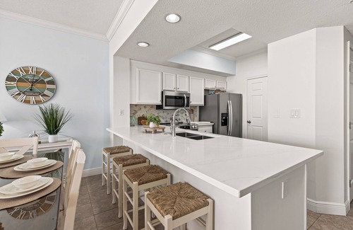 Water's Edge Unit # 409. Enjoy a broad view of the Gulf of Mexico and the shared heated pool from your private, furnished balcony! This freshly remodeled condo features all the comforts of a home away from home. There's a Keurig on hand for your morning coffee, and a Roku Smart TV for a relaxing evening in after a day spent on the sandy shore. Out on that beachfront balcony, you'll enjoy a view of seasonal fireworks at Ft. Walton Pier, weekly during the summer season as well as holidays. Enjoy relaxing in a tranquil atmosphere throughout, with central air conditioning and tile flooring, complete with new throw rugs, ensuring everyone is cool and comfortable. The full kitchen is perfect for whipping up a snack or a meal, and is complete with full-size appliances and a breakfast bar that seats four guests. The main bedroom features a lovely en-suite bathroom with two vanities, a standalone shower, and a soaking tub for guests to enjoy. Younger guests can relax in a built-in bunk bed in their own room. Family games, books and puzzels for all ages are also on hand. But no matter where you decide to sleep, all guests can enjoy access to two shared freshwater pools and a shared fitness room during their stay.