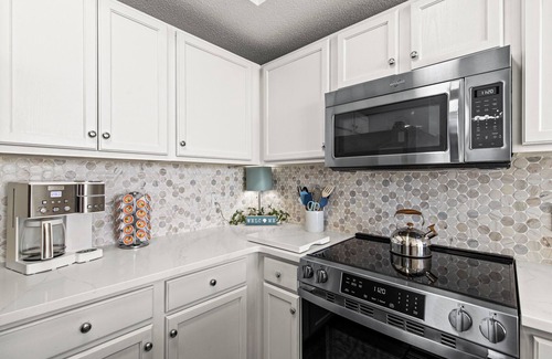The Kitchen has a stainless steel refrigerator with ice-maker, microwave, dishwasher and ceramic cooktop stove. The new coffee pot is a dual regular coffee as well as Keurig. I provide Keurig coffee pods for your convenience. The spacious pub-style dining table has room for four and the granite topped breakfast bar provides additional seating. Fully stocked kitchen with new cookware and children friendly dishes as well.