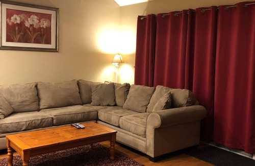 Two bedrooms are on the lower level one has a set of twins bunk beds & a full size bed with cable TV, and the other has a Queen size bed with cable TV, full bath, washer and dryer. The bottom level has a family room, it contains a full-size futon, cable TV. A perfect escape for the children or the adults. There is also a 4th bedroom on this level. The upper loft has a queen-size bed, cable TV, and a bathroom with a stall shower.