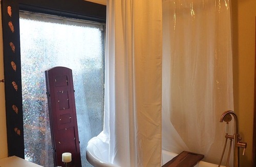 One bedroom, nonsmoking, guest suite with 14 foot ceilings, wood floors, keypad entrance, located in a high end, quiet & safe neighborhood, nestled next to the base of the Sandia Tram. It is about 1500 feet above most of Albuquerque with fantastic views. Queen bed: 4 poster bed comfortable with a Casper mattress & 2000 thread count sheets for a comfortable nights sleep. There is a Bluffdale McGee breakfast table paintings, a sitting area with a small couch and a swivel club chair in front of an electric fireplace, a full bathroom with dual copper sinks, Vera Wang towels, a claw foot tub & shower head. Has a kitchenette with an all in one microwave, (you can select air fry, bake, broil, microwave). Choose from a number of teas, Mr. Coffee or Kerig. A guest laundry with laundry soap is provided, and is shared with another unit. 55 inch smart TV with Paramount & Hulu. Also has Roku, Tubi, & Peacock. There is a long balcony with an Adirondack chair, small table & a couple of outdoor chairs, with fabulous views. BBQ grill is available. Seasonal outdoor pool, end of May to September. Parking for one car or pickup, if you have a second vehicle please inquire.