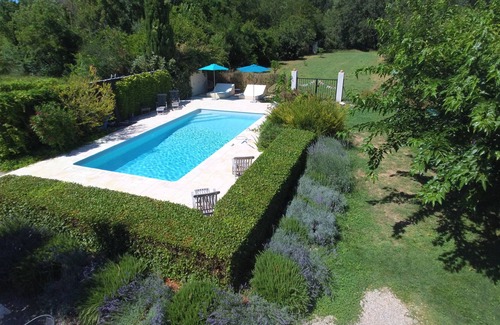 Beautiful pool (5 by 10 meters), with a big terrace, pool house and deckchairs surrounded by palms, lavender and pine trees. The big garden reaches down to the river with nice old trees like cherry trees and oak trees to end at the landing stage for our private canoes.