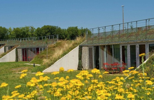 Les Collines de Ste Féréole offers 25 modern holiday houses with WiFi. They are spread across four hectares of hilly countryside with an open view of Bassin de Brive lake. The houses are nestled in the heart of the hill, keeping them nice and cool in summer and pleasantly warm in winter. There are three different kinds of houses: a 2-person one-bedroom (FR-19270-08), a 4-6 person two-bedroom (FR-19270-09) and a 6-8 person two-bedroom that has two bathrooms (FR-19270-10). The houses are constructed of raw concrete in a minimalist style with green roofs. The furnishings are modern. All houses have large windows and a private terrace with garden furniture. The beds are made on your arrival. Cars are parked at the central car park.