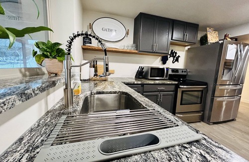 If you’re a cook, this kitchen is set up for your culinary enjoyment. The granite countertops and deep single bowl sink make prep work so pleasant. We’ve also included a fabulous coffee station and many small appliances, such as an electric skillet, slow cooker, and even an InstantPot! And if you’re not interested in cooking, we’ve included a list of all the best places to eat nearby.
