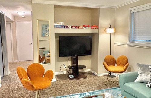 You’ll enjoy a private entrance with smart lock access, reserved parking, WiFi, AC, a fully equipped kitchen with modern appliances, a patio basketball hoop, and a laundry room for added convenience.