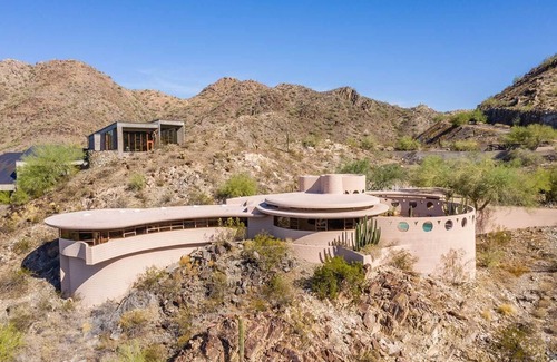 Designed to blend in with the curves of the surrounding desert mountain, this iconic masterpiece is the last home designed by Frank Lloyd Wright. Overlapping concentric circles create a floor plan that flows seamlessly from one room to another while every room takes in unobstructed majestic views of Palm Canyon and the city below.