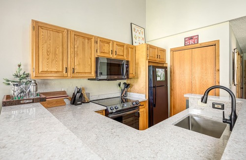 This entertainer's paradise is a 1100 square foot 2 bedroom, 2 bathroom condo sitting on the first hole of the Schuss Golf course with a gorgeous view of the mountain. Open concept floor plan, brand new flooring, appliances , Quartz counter tops and all the modern amenities you could need without sacrificing the cabin aesthetic.