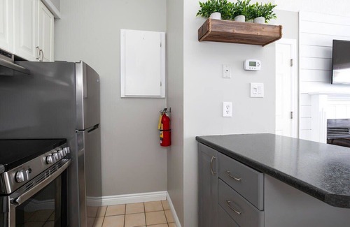 Step inside to an open-concept main floor with a fully equipped kitchen complete with stainless steel appliances and a dining table that seats 4. The main floor sleeping area is ideal for families, offering a double-over-double bunk bed plus a twin trundle for a 6th guest (please note: the top bunk has a 200 lb. weight limit and is best suited for two children or one adult).
