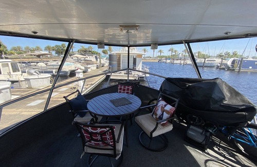 Luxurious 60-foot, 2-story moored houseboat. Brand new mini split a/c system just installed. Accommodates up to 4 people. Flat screen TVs throughout, WiFi, comfy queen-sized beds, and a kitchen with residential appliances and all the tools you need. Permanently docked in a safe, secure marina on scenic Lake Monroe, part of the St. John's River system. Just a short walk to funky art galleries, retail/antique/resale shops, microbreweries, a Belgium beer bar, wine bar, and great restaurants. Take a 5-minute car ride to the Central Florida Zoo and zip line. In 15 minutes you can be at the crystal-clear Blue Springs State Park. You are 45 minutes from Disney and the theme parks. Or just relax up top! PLEASE NOTE: The boat is permanently docked. Guests are NOT permitted to drive the boat. Think of it as a floating/water-top condo. Under no circumstances may guests drive the boat. Garbage must be removed at checkout.