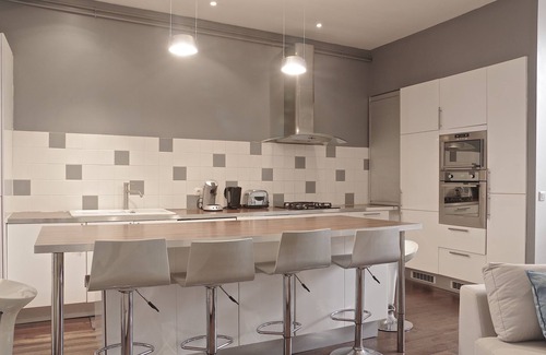 a fully equipped American kitchen with oven and microwave, dishwasher, fridge / freezer, induction hob, kettle, Nespresso machine, toaster and everything you need for cooking