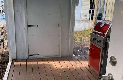 This tiny glamping home kitchen has been updated and offers beautiful tile backsplash, new gas range, microwave, air fryer/toaster oven, & refrigerator. Roku TV in the living area for streaming and some local / national channels, WIFI & Internet included. The bedroom has black out curtains to ensure a restful sleep on the queen pillow top bed, a desk that is used for work space and make up area. Plenty of closets space (with mirrors) and drawers for storage.The enclosed lanai offers lots of natural light, additional seating and table for alfresco dining, the electric fireplace is wonderful for heat and ambience. This home is truly a place to relax, unwind and enjoy nature. If activities are on your vacation agenda, you're at the right place with so many amenities on the to choose from: heated pool, spa, tennis & pickle-ball, shuffle board, kayak rental, fishing pier & boat ramp as well as arranged activity monthly calendar and food trucks.