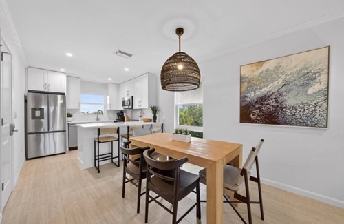 Unit 36 features a soothing coastal design with sophisticated décor and designer touches throughout. The open living room offers comfortable seating and a flat screen TV, flowing into the dining area and a beautifully updated kitchen with stainless steel appliances, a custom island, and wood floors that bring a warm, inviting feel.