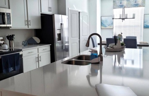 The Kitchen Area features a large island with quartz countertops and three 360-degree swivel bar stools. A large pantry, bar area, full size refrigerator, stove, microwave and dishwasher complete the kitchen. Several small appliances, including toaster, a Keurig/drip coffeemaker combo, coffee grinder, electric mixer, and blender are conveniently stored in the cabinets, along with barware, glass and plastic drinkware, dishes, serving ware, cookware, cutting boards, and kitchen gadgets.