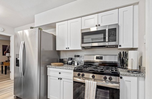 • Fully stocked kitchen w/ stainless steel appliances (including refrigerator/freezer w/ in-built water + ice dispenser)