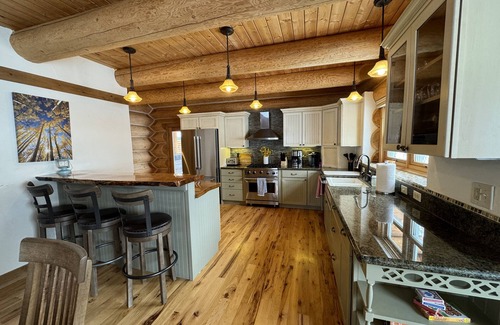 Primary suite on the main level offers a king bed, large steam shower and walk-out to hot tub! The main level also has a freshly remodeled kitchen w. new Viking appliances. A large table for hosting groups. The upper level hosts a second bedroom with en-suite, king bed, and queen over queen bunk bed. There is a loft with arcade games a couch and TV. The lower level has 3 bedrooms, a king bed in room 1, two queen beds in second room and two full beds in room 3. A second full kitchen, and family room. Viking hot tub to relax after a day of hiking, snowmobiling or just enjoying the views! 30 day minimum rental. Contact for booking options.