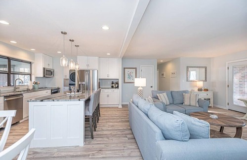 Newly renovated from floor to ceiling in 2024. New couch was added for the 2025 season. This home has new flooring, ceiling fans, light fixtures, furnishings, and is newly painted. The kitchen and all 3 bathrooms have been totally remodeled. With 4 bedrooms and 3 full bathrooms, this home can accommodate the whole family comfortably. There are two master suites, one upstairs and one downstairs both with walk in tiled showers. The downstairs has the main living space, kitchen, 3 bedrooms, 2 bathrooms, and a spacious sunroom overlooking the canal. The upstairs has a den, bedroom, bathroom, and kitchen area with wet bar and wine refrigerator. As you enter, enjoy the open floor plan of the central living space. The kitchen offers granite countertops, new cabinets, and all new stainless-steel appliances. From the kitchen, you enter the sunroom which has full views of the canal and water. This is a great place to enjoy your morning coffee as you watch the seagulls and kayakers begin their day. The back deck is the perfect way to unwind after a long beach day. Sit at the table and have your evening meal or relax in the chairs as the sun goes down. Bring your boat and take advantage of docking your boat right at the property. There is even a fish cleaning station for the fisherman in the family. The property has a boat lift that is not for tenant's use. Please view the Dock Layout picture to see how you can dock your personal vessel. The deck has several Adirondack chairs that are great for afternoon lounging. The laundry area has a new stainless steel full sized stackable washer and dryer. The upstairs den offers a nice extra area for the kids to gather and watch a movie. With the oversized couch, they can relax in comfort. If you have a larger family, the upstairs can be used as an in-law suite. Bed sizes:2 Kings, 2 Queens. LINENS AND TOWELS ARE INCLUDED IN FEES. Additional fees may apply for some community amenities including pools, golf, tennis, etc please inquire. This home is NOT available for high school/college “Beach Week.” Cancellation fee will apply. BOAT LIFT IS NOT FOR TENANT USE.